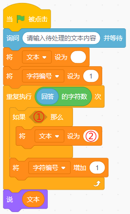 优优的键盘出现了故障,打字时经常会自动输入不想要的字母,例如输入“你可以更优秀”,则会出现“你cc可c以cc更c优c秀ccc”。通过下图中的程序可以自动将多余的“c”过滤掉,遍历每个字符,当字符不是"c"时,把它连接到变量“文本”后,图中“①”和“②”分别是下列哪个选项?( )