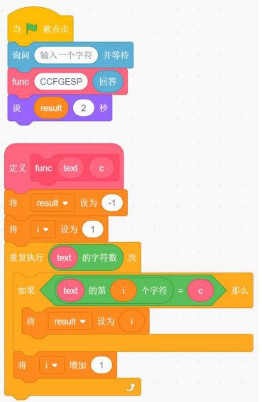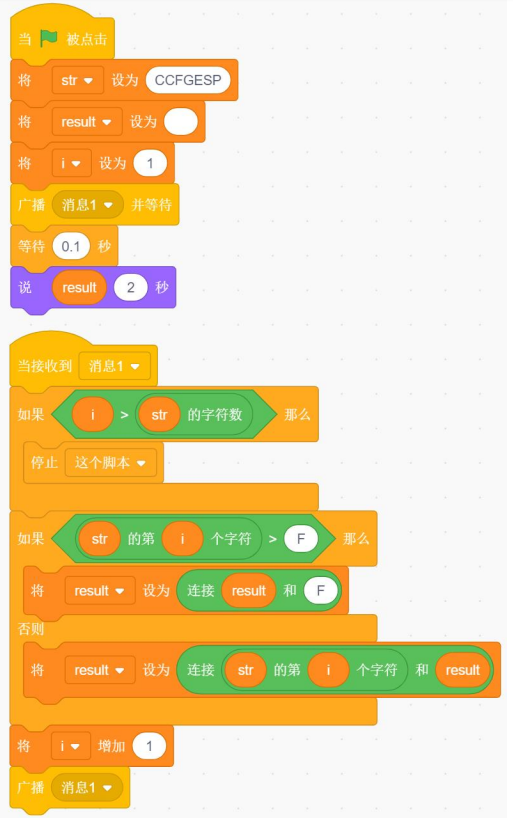 默认小猫角色,执行下列程序,输入 CCFGESP,小猫说出的内容是?
