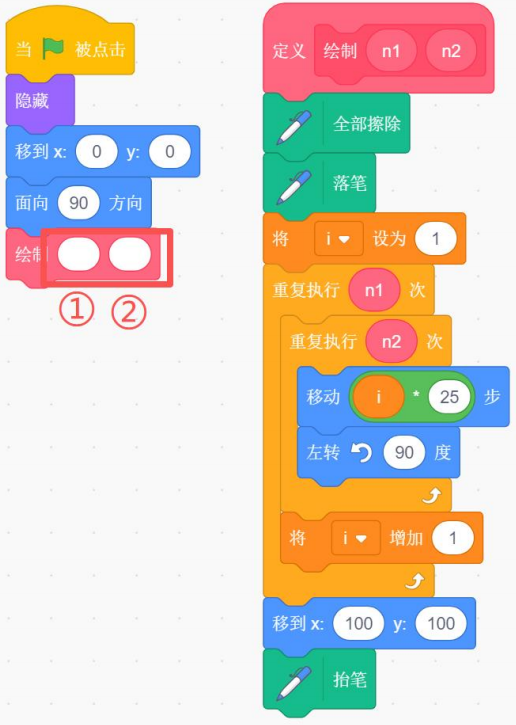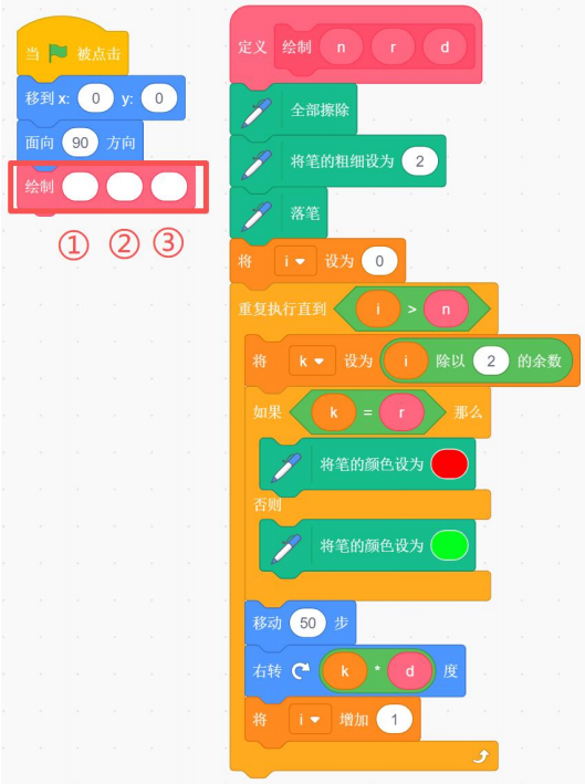 默认小猫角色,执行下列程序,绘制出如下图形,红框处填写的数值是?