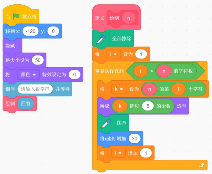 默认小猫角色,执行下列程序,红框处依次填入 5 和 4,能够绘制出如下所示图形。