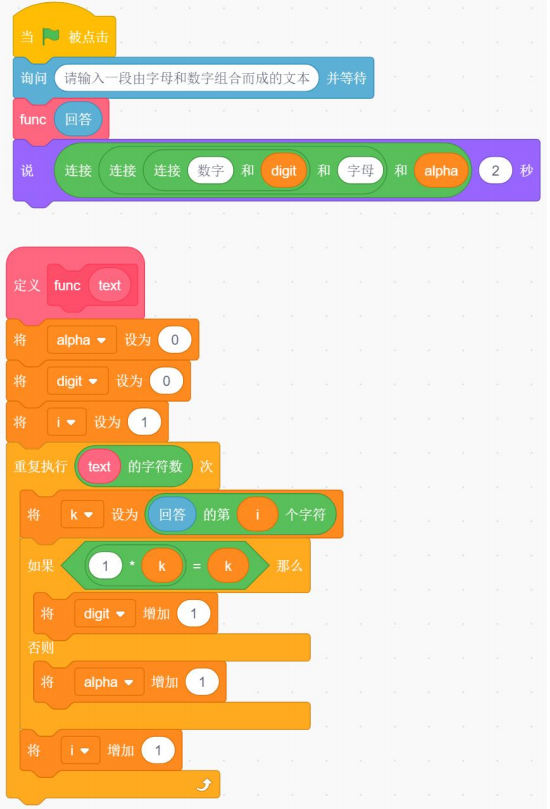 默认小猫角色,运行下列程序,输入 CCFGESP2025 后,可统计出数字和字母的个数。